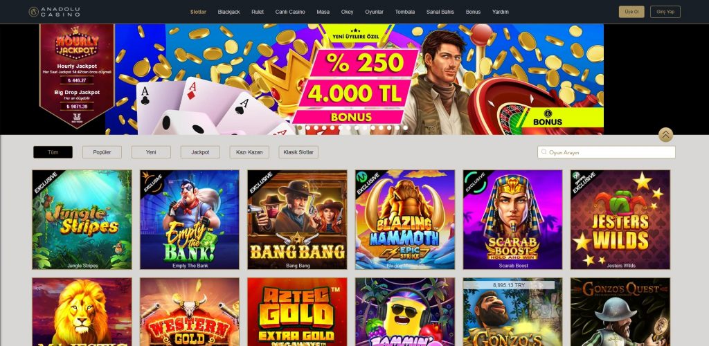 Anadolu Casino sitesinin ana sayfasına giriş yapıp casino ve slot oyunlarını buluyorsunuz. Sitenin menüsünde casino oyunları ile beraber canlı casino oyunları yer alıyor. Canlı bahis oyunları, gerçek oyuncularla ve gerçek para ile katılabileceğiniz platform sunuyor. Anadalo Casino bünyesinde;